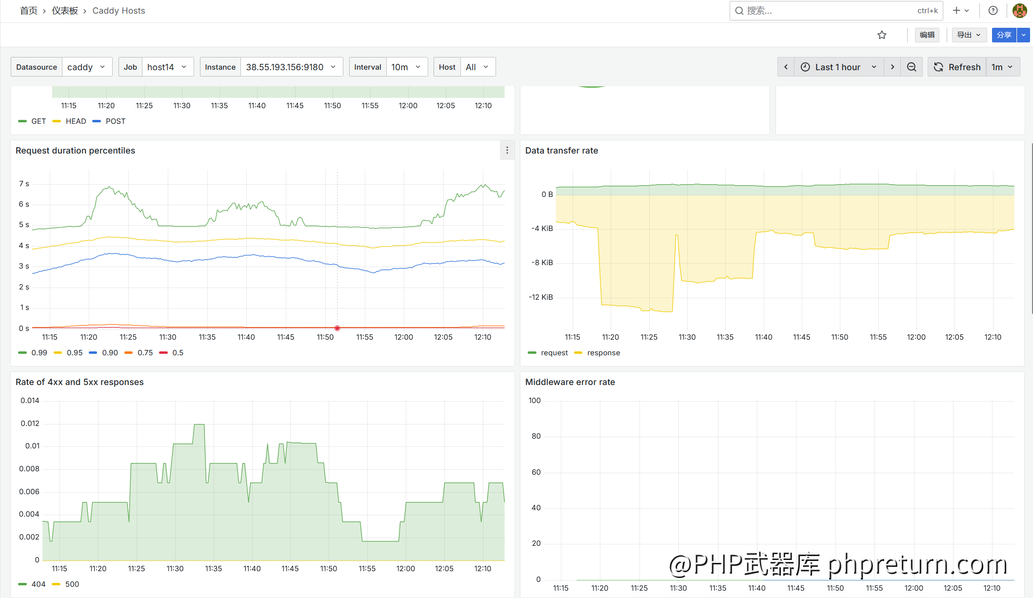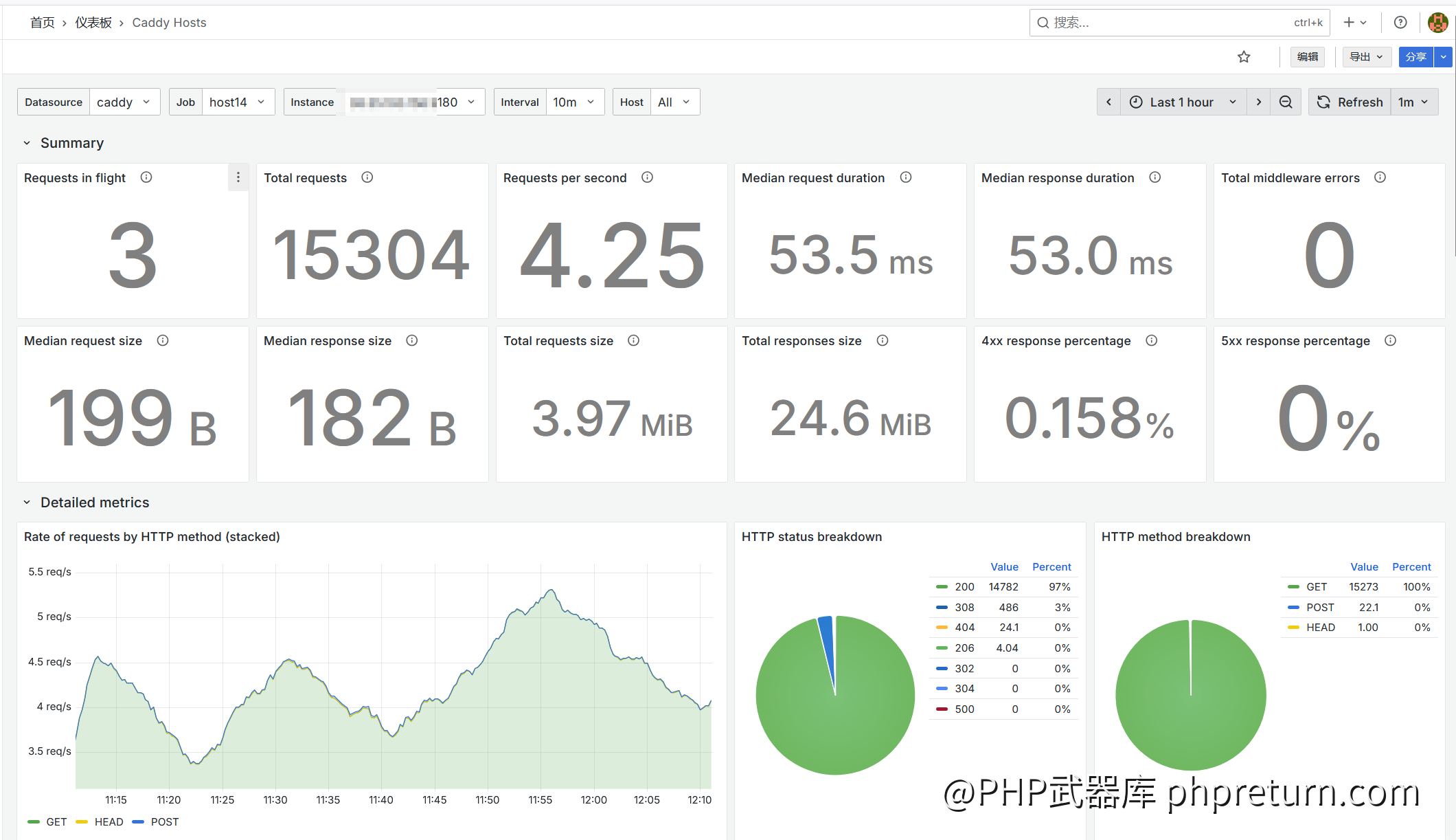 瞬间,一个专业的 Caddy 监控仪表盘就呈现在你眼前! 你可以看到实时的请求数、延迟、状态码分布,甚至可以按不同站点分别查看。