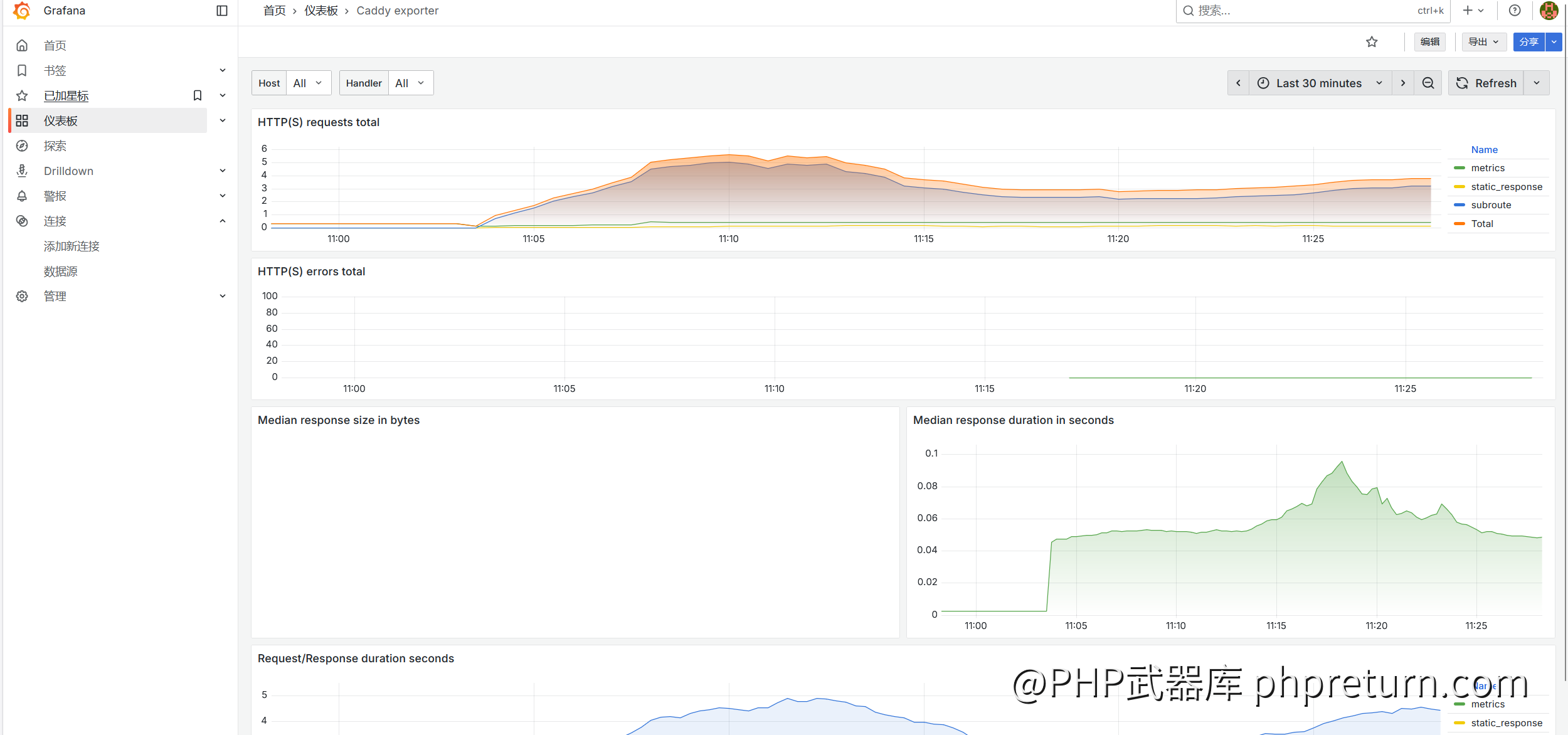 - 这是一个简洁的仪表盘,包含了请求总数、错误数、响应大小和延迟等核心指标。适合快速上手。